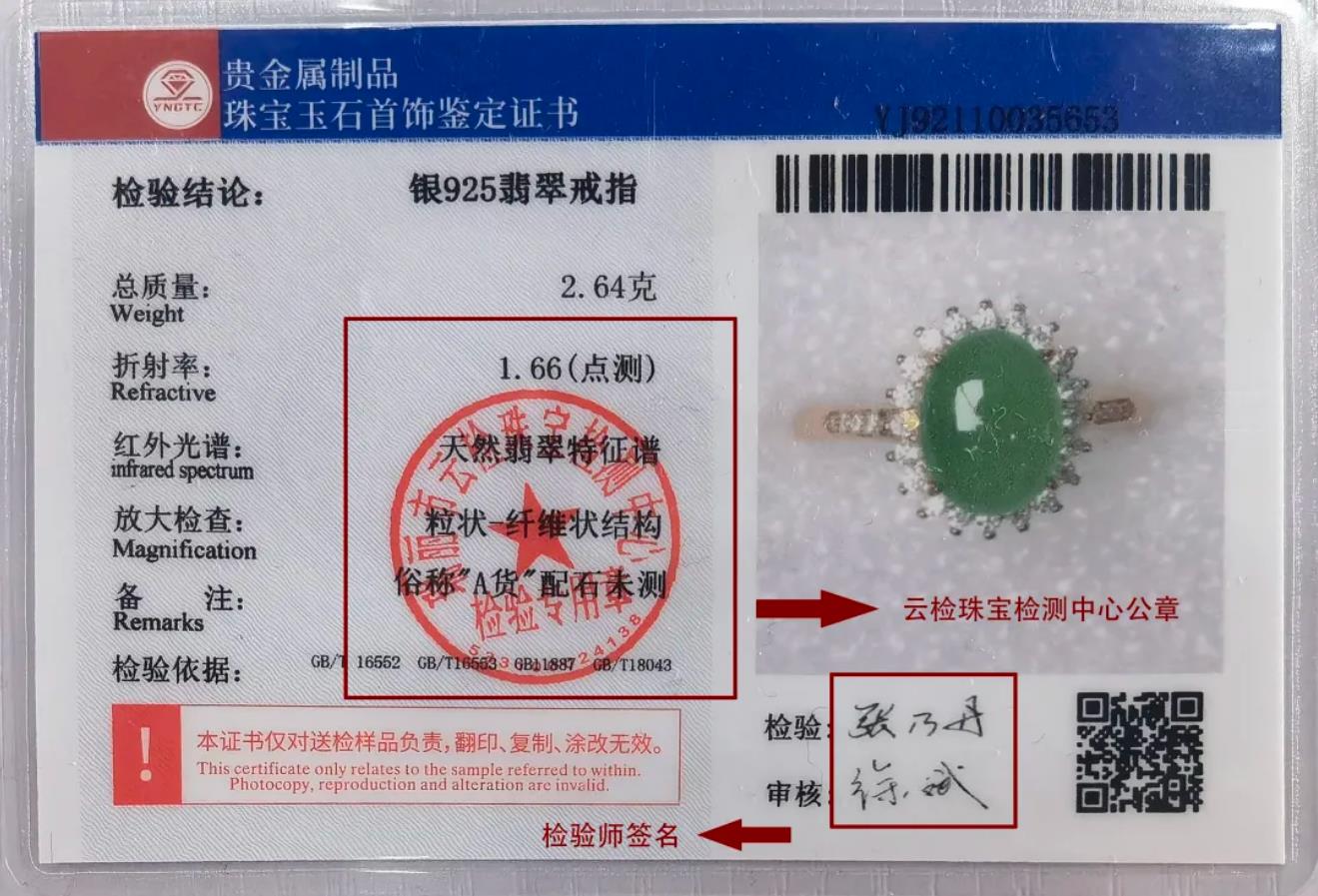 新球体育 珠宝玉石首饰鉴定证书背面有单位公章和检验师签名