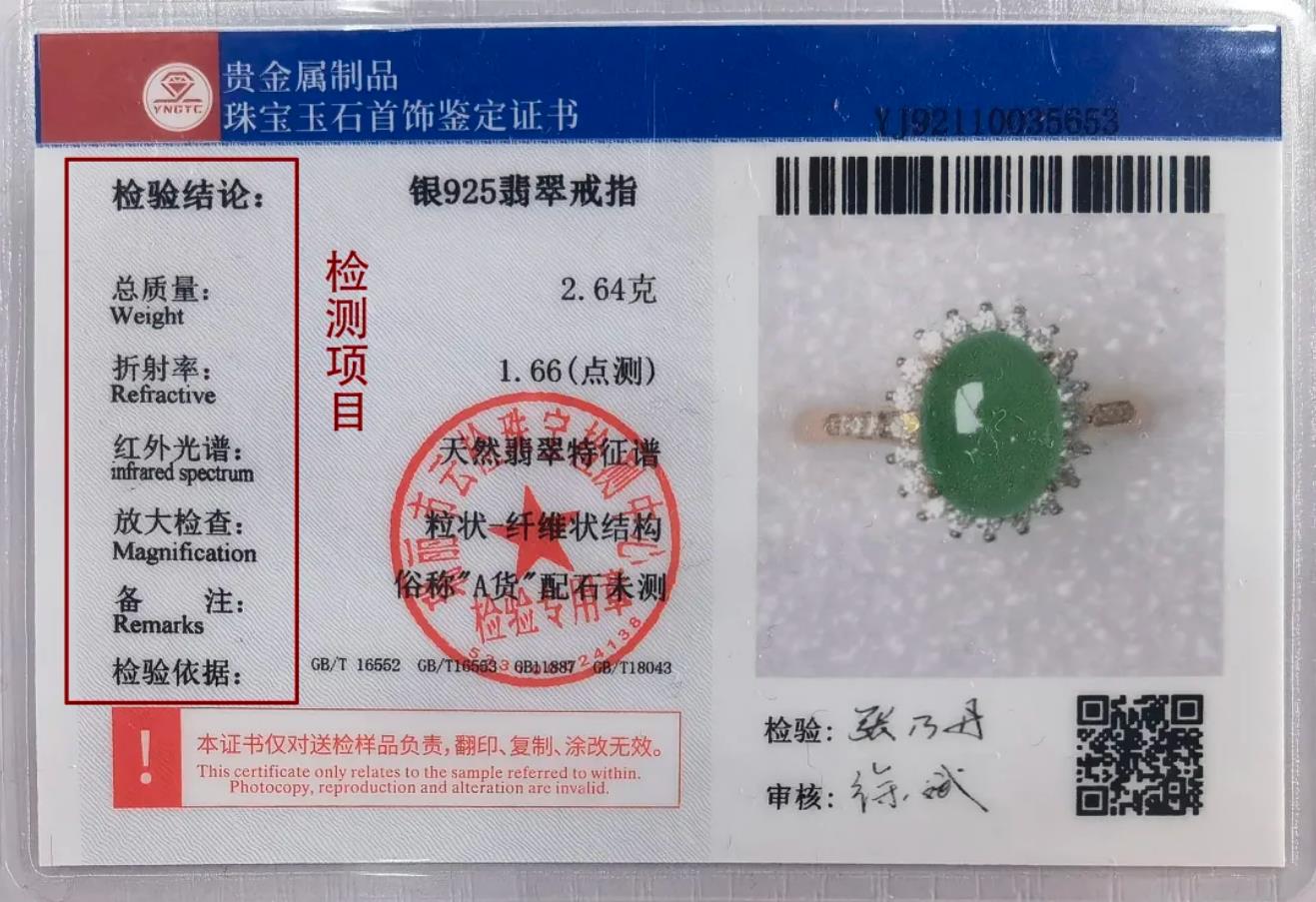 新球体育 珠宝玉石首饰鉴定证书背面有“检测项目”