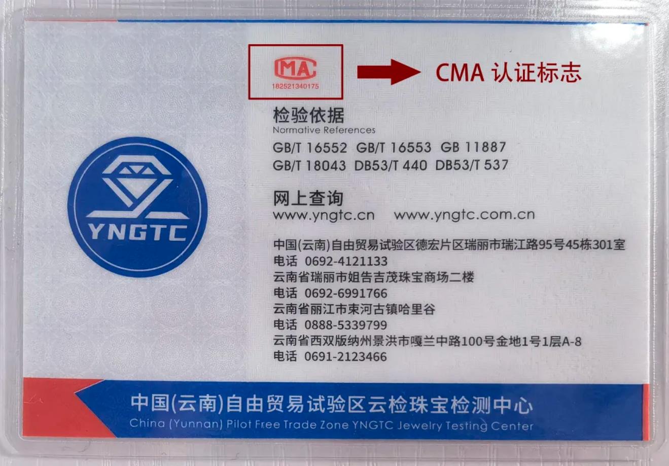 新球体育 是根据《中华人民共和国计量法》、《中华人民共和国标准化法》、《中华人民共和国产品质量法》、《检验检测机构管理办法》等有关规定,通过了云南省市场监管局的检验检测机构资质认定评审,取得资质证书,主要开展珠宝玉石及贵金属检验检测工作的第三方公正机构,中心所出具数据(证书和报告)具备法律效力并承担相应的责任。新球体育 出具的证书上有明显的CMA认证标志。